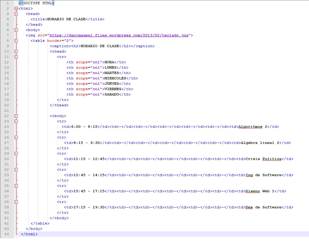 1. Crear una tabla en Html5 con la hora, los dias de la semana y las clases que reciben por dia y en la parte superior debe aparecer horario de clase y una imagen que tenga ver con ingeniería o tecnolgía de sistemas.